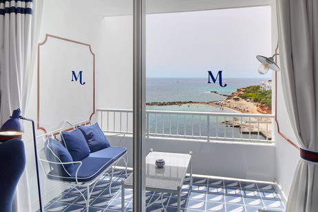 Nuestras habitaciones Doble Vista mar son todo luz y brisa directa del mar Mediterráneo. Sus ventanas de suelo a techo te permiten desde la propia cama levantarte viendo el mar en calma. Todas las habitaciones vista mar tienen baño completo privado, ducha, cabecero de diseño y están llenas de detalles elegantes que te trasladarán a la Dolce Vita de inmediato.